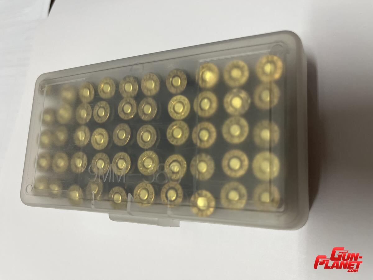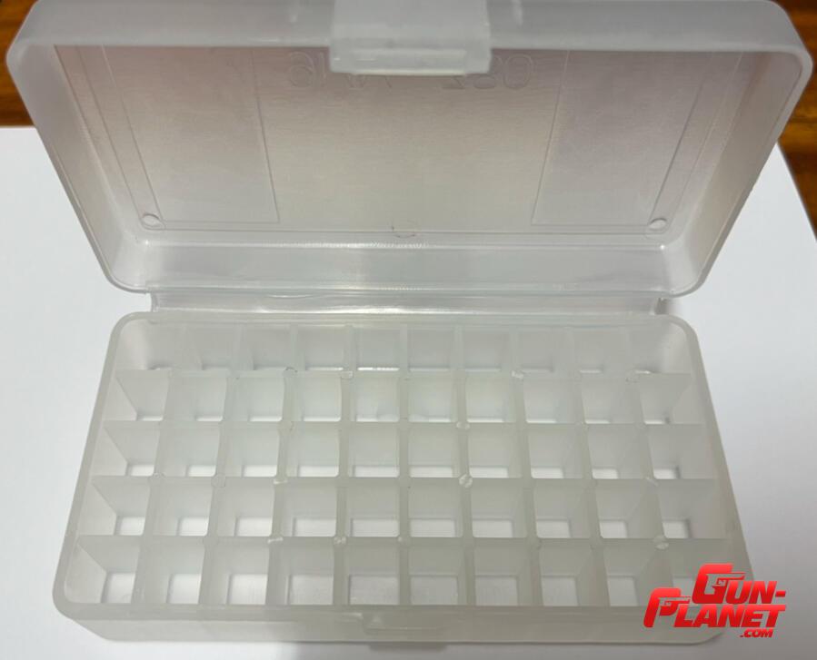 Caja porta munición para calibre 9mm y 380. Capacidad 50 municiones,Realizada en pp industria Argentina.color natural hay stock….