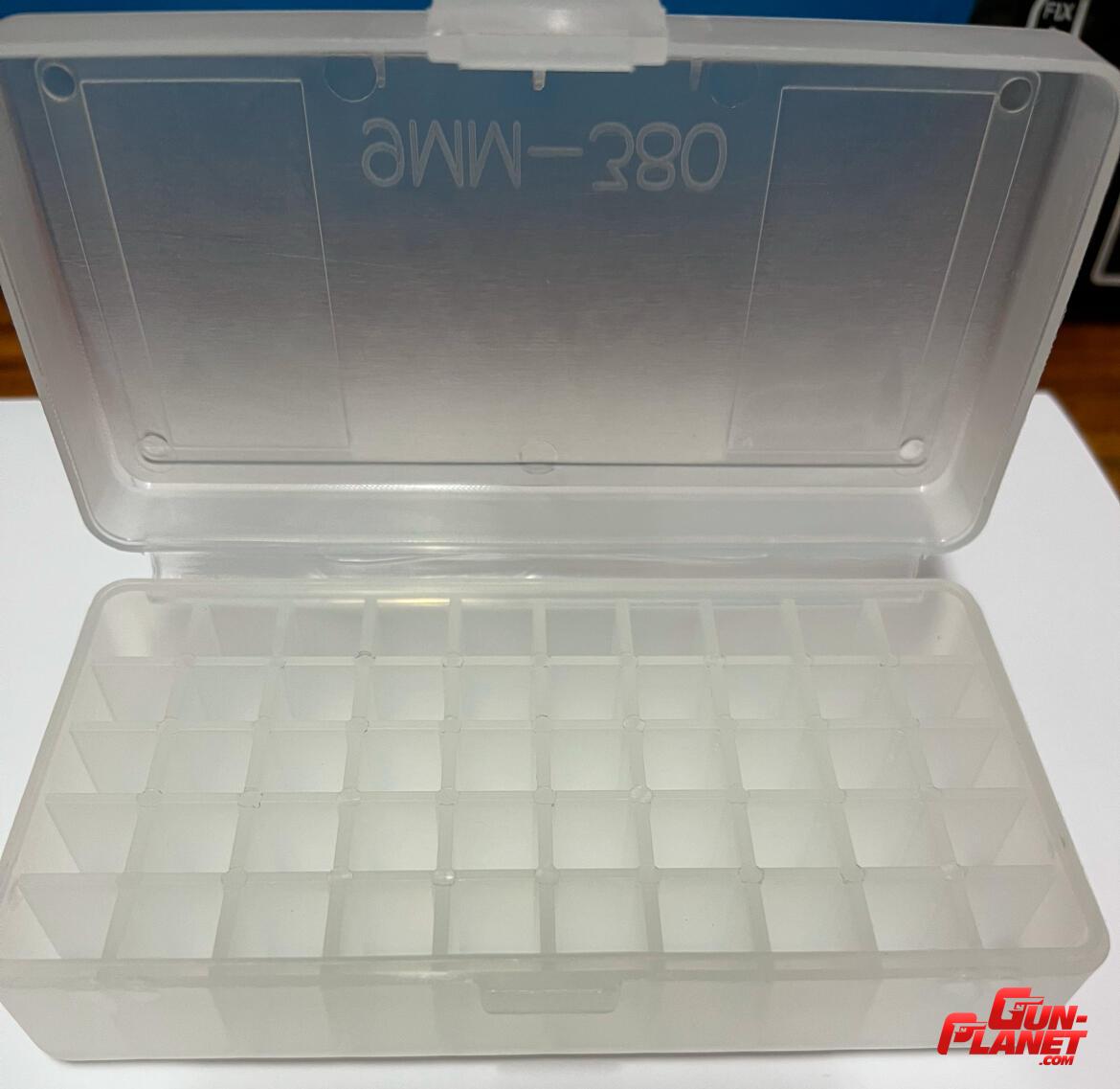 Caja porta munición para calibre 9mm y 380. Capacidad 50 municiones,Realizada en pp industria Argentina.color natural hay stock.