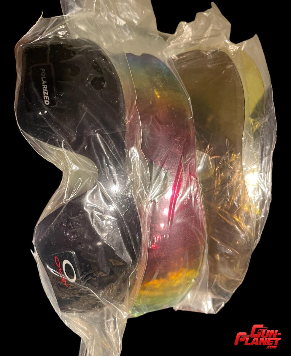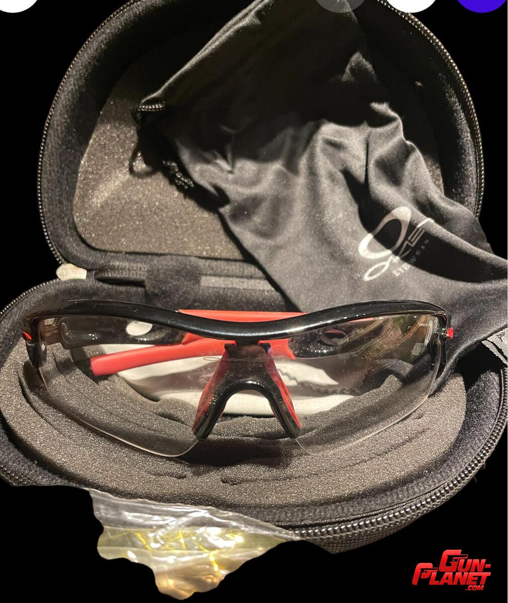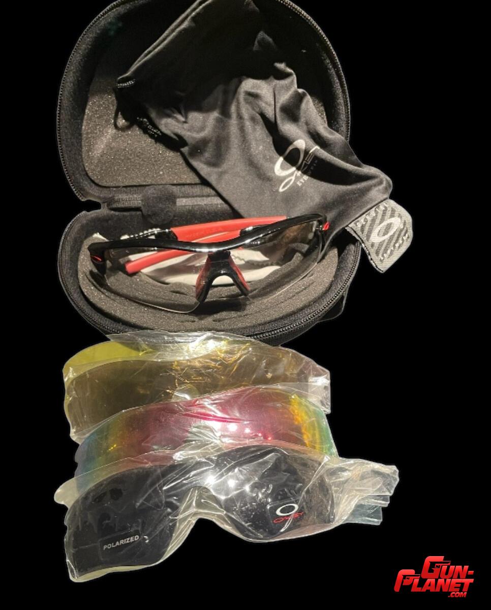 Lentes Oakley protección UV estuche rígido y funda. Armazón Blackcamo con detalles en rojo 5 lentes intercambiables