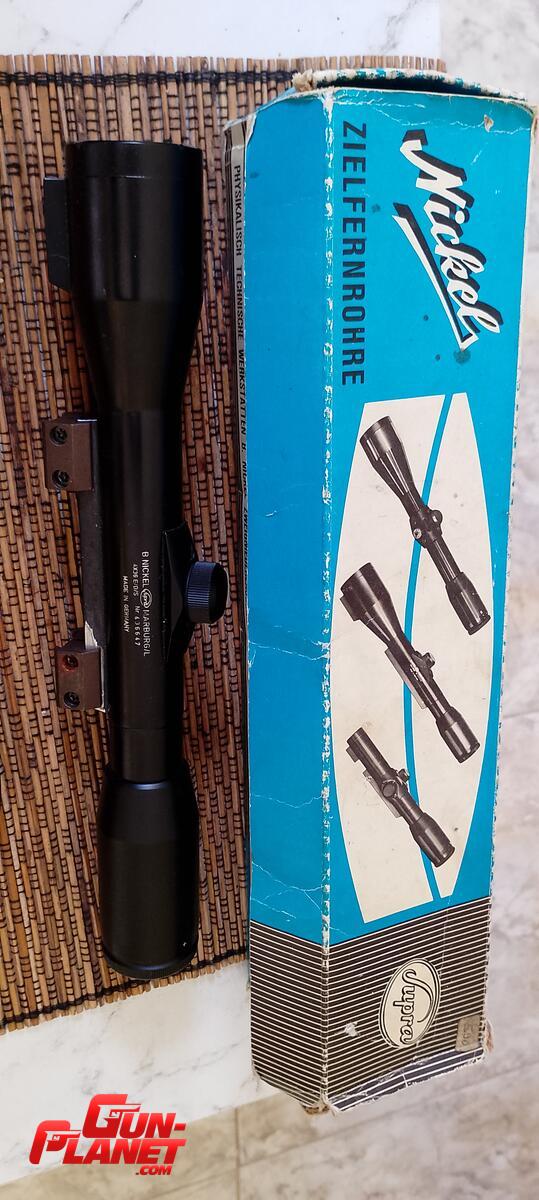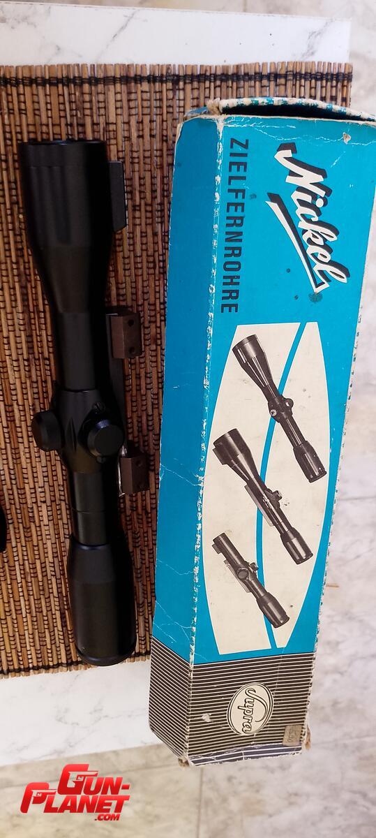 Mira de coliza alemana nikel supra 4×36 Rt 1 muy luminosa con anillas de acero tipo wiver con su respectiva caja original de época .cristales y mecánica de la misma muy buena